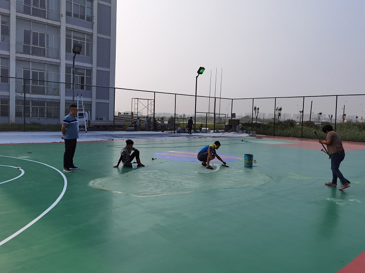 灌西籃球場總面積約510平米,附屬球場地面600平米,外圍護(hù)欄高3米。項目圍繞關(guān)鍵節(jié)點及重難點,強(qiáng)化施工組織,統(tǒng)籌施工進(jìn)展。籃球場地面露天暴曬,溫度極高,仿佛蒸籠一般。施工人員在進(jìn)行鑿地、涂漆時,僅幾分鐘的功夫,衣服從里到外被汗水浸濕,隨時有中暑的可能性,項目組把責(zé)任明確到個人,開展班前安全教育活動,保證施工安全。施工單位南翼工程公司負(fù)責(zé)人錢明偉克服人員緊缺,工期緊迫等問題,頂著高溫,始終奮戰(zhàn)在工程項目第一線。